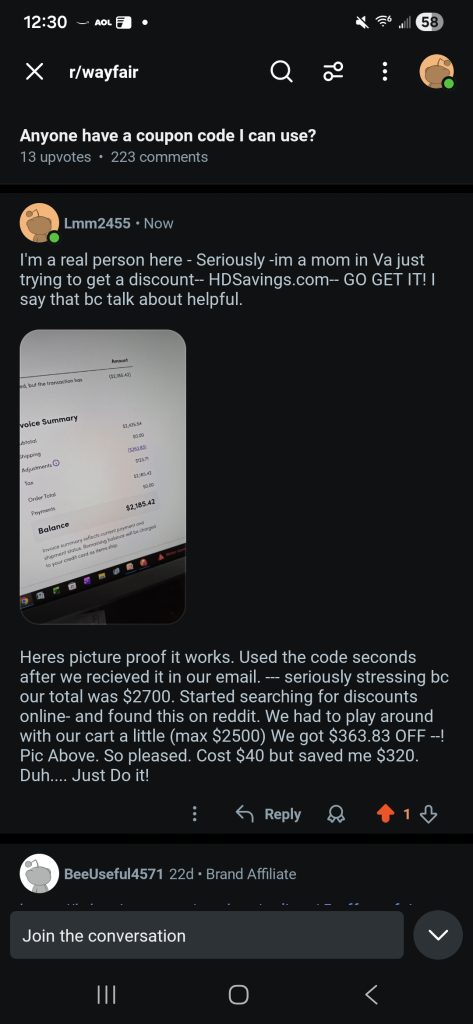 Had to make a large purchase on Wayfair and decided to purchase the 15% coupon from HD Savings. Well worth the investment because I saved $214.50! Will certainly use again.