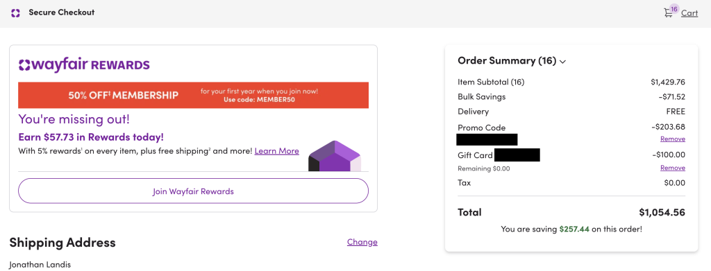 I was skeptical (like I’m sure most were) but this is legit. I will note that I had $38 in rewards to spend at Wayfair, but the other $100+ was saving from the 15% coupon. I paid $40 for the coupon, so I saved $60 overall. Totally worth it. Glad I went to Reddit to fun this deal of a website.